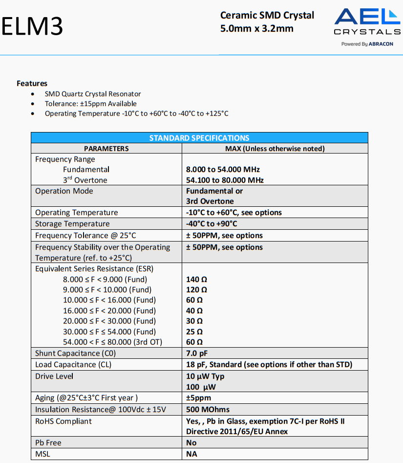 ELM3-24.000MHz-18-R40-D4H-T | AEL Crystals | ELM3 | 24 MHz | ±50ppm | ±30ppm | 18 pF |
