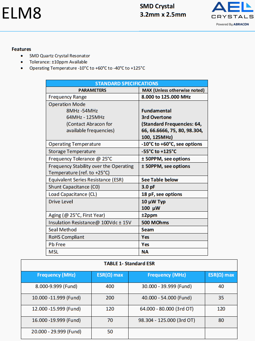 AEL無線網絡晶振,ELM8美國晶振,ELM8-12.5829MHz-16-R60-1U-T貼片晶振,美國AEL晶振公司,AEL晶振,無源晶振,ELM8晶振,ELM8-12.5829MHz-16-R60-1U-T晶振,3225晶振,四腳晶振,高精度晶振,高質量晶振,貼片晶振,無源晶振,歐美晶振,小型晶振,汽車收音機晶振,車載多媒體晶振,工業設備晶振,環保無鉛晶振,石英晶振,高穩定性晶振,醫療設備晶振,低損耗晶振。特點:SMD石英晶體諧振器,公差:±10ppm,工作溫度0°C至+70°C至-55°C至+125°C。