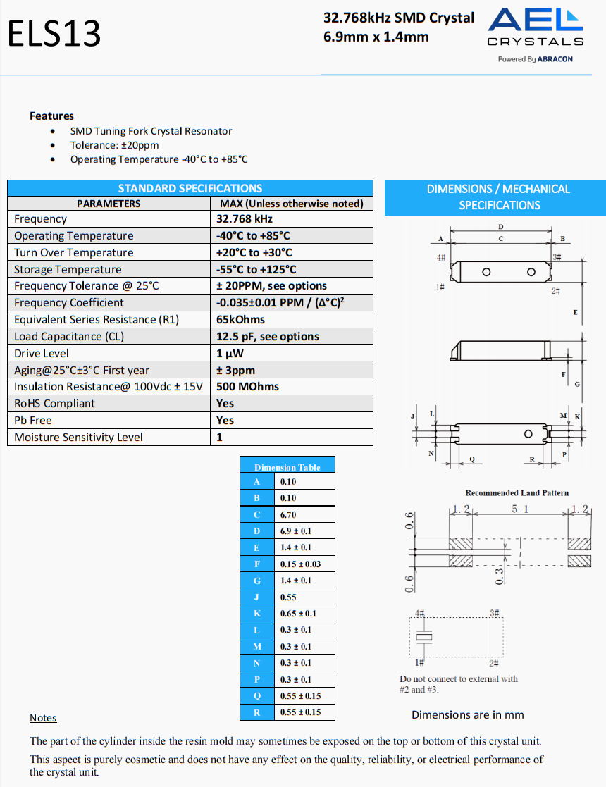 ELS07-32.768kHz-6-T | AEL Crystals | ELS07 | 32.768 kHz | 0 | ±20ppm | 6 pF |