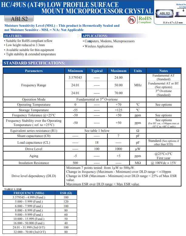 ABLS2-29.4912MHZ-D4YF-T | Abracon晶振 | ABLS2 | MHz Crystal | 29.4912MHz |