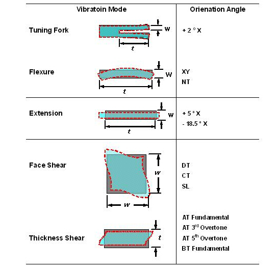 經由不同的石英切割角度及不同電極型狀的電場效應, 石英芯片展現了各種不同的振動模態. 以經常產生的振動模態可以概分為擾曲模態(flexure mode), 伸縮模態(extension mode), 面剪切模態(face shear mode) 和 厚度剪切模態(thickness shear mode). 這幾種振動模態以簡單的方法在表一中可以看到. 在實際狀況中, 石英芯片并不是一定祇有單一種振動模態, 而可能有多種模態同時存在在一個石英芯片的振蕩中, 經由適當的設計, 可以壓制其它不希望產生的振動模態(unwanted mode), 來達到主要振動模態的最佳化.