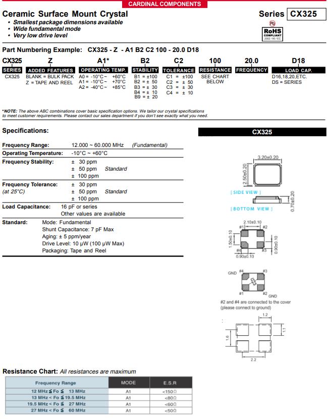 CX325Z-A5B2C5-50-18.0D18 | Cardinal晶振 | CX325 | 18MHz | 50 Ohm | -20°C ~ 70°C |