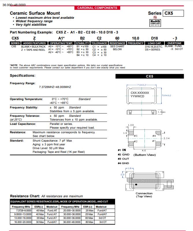 CX5Z-A1B2C5-40-24.0D18 | Cardinal晶振 | CX5 | 24MHz | 40 Ohm | -10°C ~ 70°C |