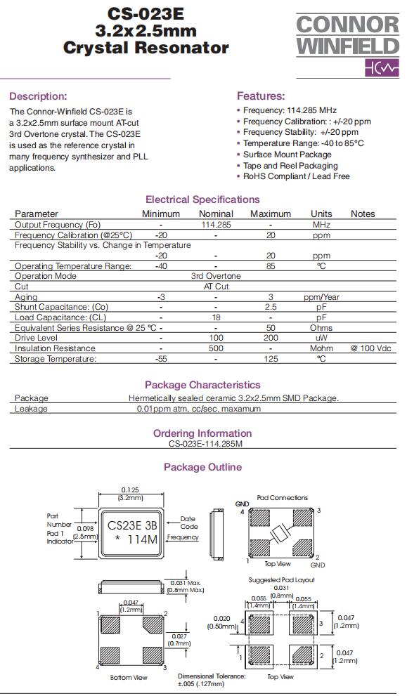 CS-023-114.285M | Connor-Winfield | CS-023 | 114.285MHz | ±20ppm | ±20ppm | 18pF | 80 Ohm | -40°C ~ 85°C |