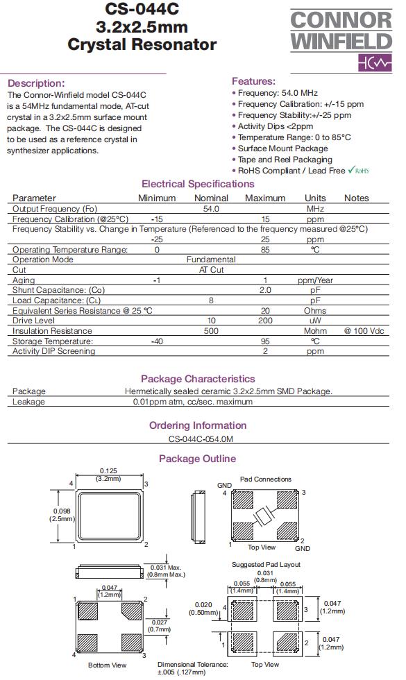 CS-044-054.0M | Connor-Winfield | CS-044 | 54MHz | ±25ppm | ±15ppm | 8pF | 20 Ohm | -40°C ~ 85°C |