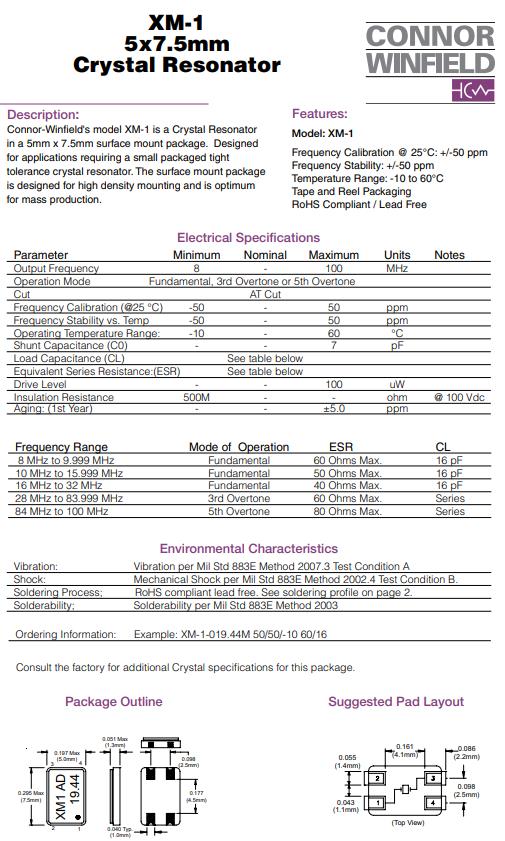 XM-1-018.432M | Connor-Winfield | XM-1 | 18.432MHz | ±50ppm | ±50ppm | 16pF | 40 Ohm | -10°C ~ 60°C |