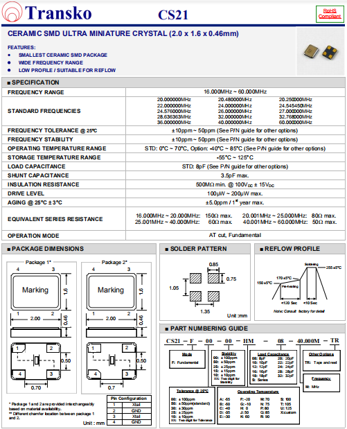 Transko晶振 | 單位 | CS21晶振 | 石英晶振基本條件 |