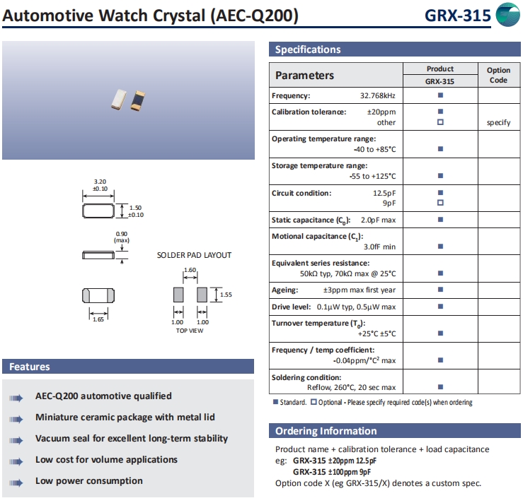 Golledge晶振,GRX-315晶振,音叉石英晶體.普通石英晶振,小體積SMD時(shí)鐘晶體諧振器,是貼片音叉晶體,千赫頻率元件,應(yīng)用于時(shí)鐘模塊,智能手機(jī),全球定位系統(tǒng),因產(chǎn)品本身體積小,SMD編帶型,可應(yīng)用于高性能自動(dòng)貼片焊接,被廣泛應(yīng)用到各種小巧的便攜式消費(fèi)電子數(shù)碼時(shí)間產(chǎn)品,環(huán)保性能符合ROHS/無(wú)鉛標(biāo)準(zhǔn).