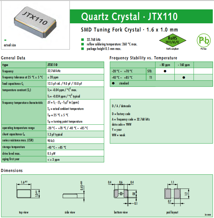 JAUCH晶振,JTX110晶振,無源環保晶體.小型貼片石英晶振,外觀尺寸具有薄型表面貼片型石英晶體諧振器,特別適用于有小型化要求的市場領域,比如智能手機,無線藍牙,平板電腦等電子數碼產品.晶振本身超小型,薄型,重量輕,晶體具有優良的耐環境特性,如耐熱性,耐沖擊性,在辦公自動化,家電相關電器領域及Bluetooth,WirelessLAN等短距離無線通信領域可發揮優良的電氣特性,滿足無鉛焊接的回流溫度曲線要求.