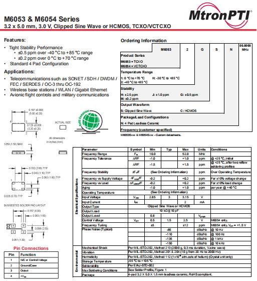 MTRONPTI晶振,M6053晶振,TCXO晶體振蕩器.5032mm體積的石英晶體振蕩器,有源晶振,該產品可驅動2.5V的溫補晶振,壓控晶振,VC-TCXO晶體振蕩器產品,電源電壓的低電耗型,編帶包裝方式,可對應自動高速貼片機自動焊接,及IR回流焊接(無鉛對應),為無鉛產品,超小型,質地輕.產品被廣泛應用到集成電路,程控交換系統(tǒng),無線發(fā)射基站.