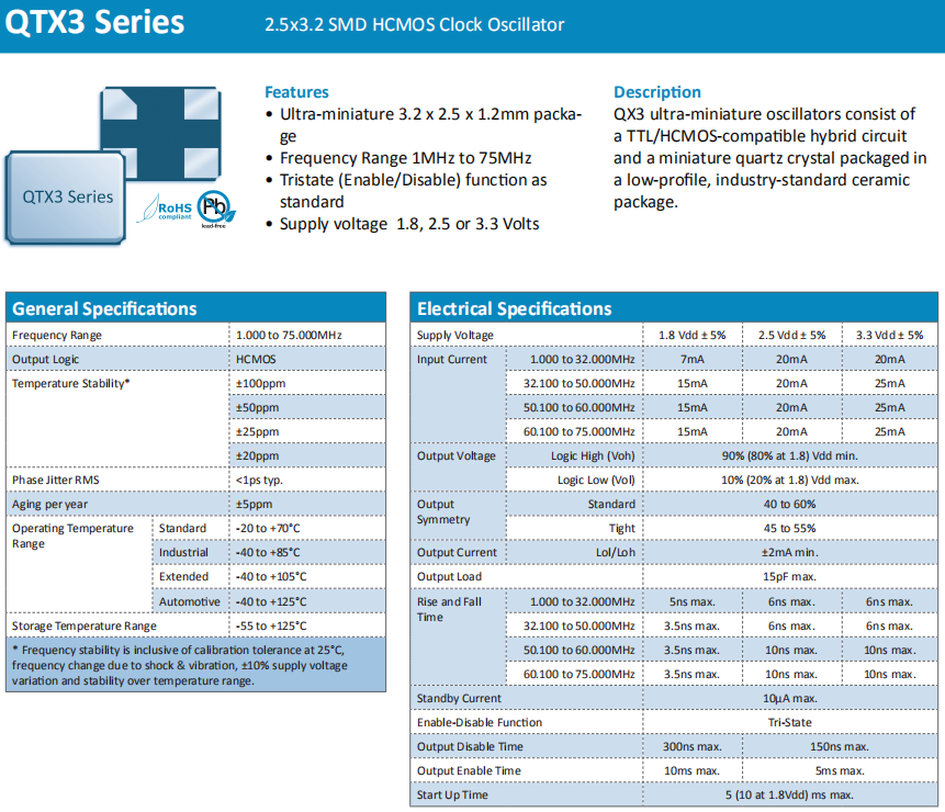 Quarztechnik晶振,QTX3晶振,耐高溫振蕩器.貼片式石英晶體振蕩器,低電壓啟動功率,并且有多種電壓供選擇,比如有1.8V,2.5V,3.3V,3.8V,5V等,產品被廣泛應用于,平板筆記本,GPS系統,光纖通道,千兆以太網,串行ATA,串行連接SCSI,PCI-Express的SDH/SONET發射基站等領域.符合RoHS/無鉛.