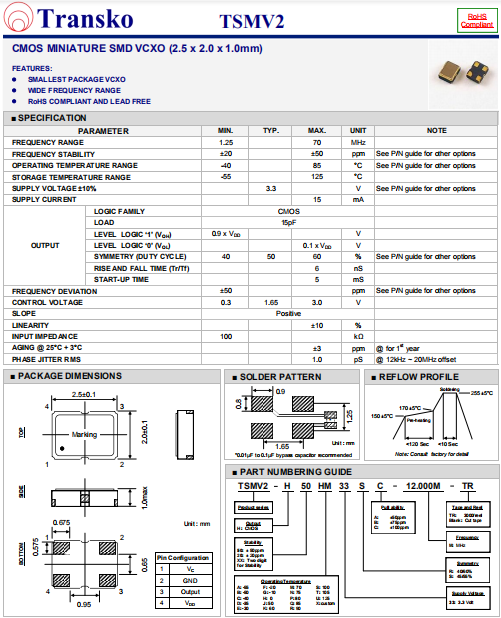 Transko晶振,TSMV2晶振,壓控晶體振蕩器.智能手機晶振,產(chǎn)品具有高精度超小型的表面貼片型石英晶體振蕩器,最適用于移動通信終端的基準時鐘等移動通信領(lǐng)域.比如智能手機,無線通信,衛(wèi)星導(dǎo)航,平臺基站等較高端的數(shù)碼產(chǎn)品,晶振本身小型,薄型具備各類移動通信的基準時鐘源用頻率,貼片晶振具有優(yōu)良的電氣特性,耐環(huán)境性能適用于移動通信領(lǐng)域,滿足無鉛焊接的高溫回流溫度曲線要求.