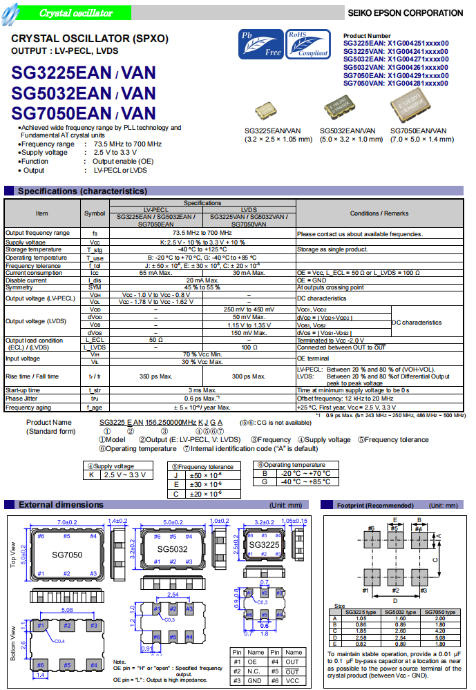 X1G0042710033 | SG5032EAN | 156.250000 MHz | 5.00 x 3.20 x 1.20 mm | LV-PECL | 2.250 to 3.630 V | -40 to 85 °C |
