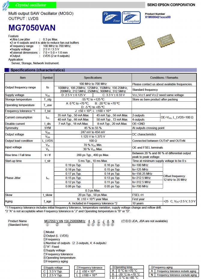 X1M0004210007 | MG7050VAN | 156.250000 MHz | 7.00 x 5.00 x 1.60 mm | LVDS | 2.970 to 3.630 V |