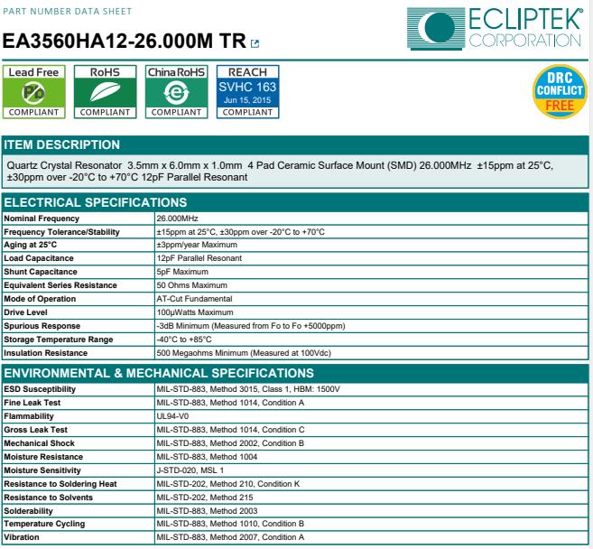 日蝕美國(guó)晶振,EA3560HA12-26.000M-TR無線通信晶振,6035mm無源晶體,我們的網(wǎng)站是為了幫助客戶確定黃華產(chǎn)品的RoHS和pb免費(fèi)狀態(tài)。我們的RoHS/pbfree認(rèn)證和IPC-1752材料聲明工具為我們的客戶提供了按零件編號(hào)處理他們的文檔請(qǐng)求的能力,并在幾秒鐘內(nèi)收到一個(gè)全面的自動(dòng)回復(fù)。