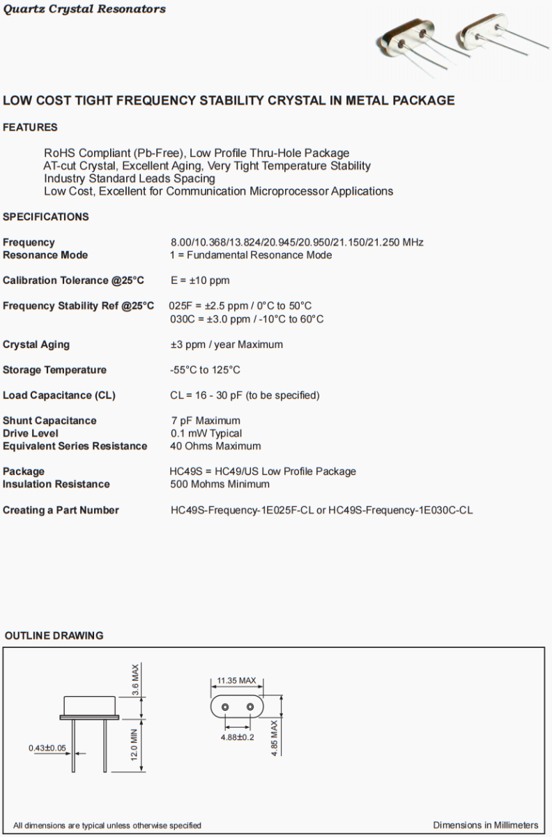 Fortiming進口晶振,49S插件晶振,HC49S-21M250-1E025F-CL無線路由器晶體,美國富通晶振公司,49S插件晶振,歐美晶振,二腳晶振,Fortiming晶振,低成本晶振,環保無鉛晶振,高穩定性晶振,石英晶振,6G網絡終端晶振,無源晶振,低成本緊密頻率穩定晶體金屬封裝,特點,符合RoHS標準(無鉛),低外形通孔封裝,at切割晶體,優異的老化,非常緊密的溫度穩定性,行業標準引線間距,低成本,卓越的通信微處理器應用。
