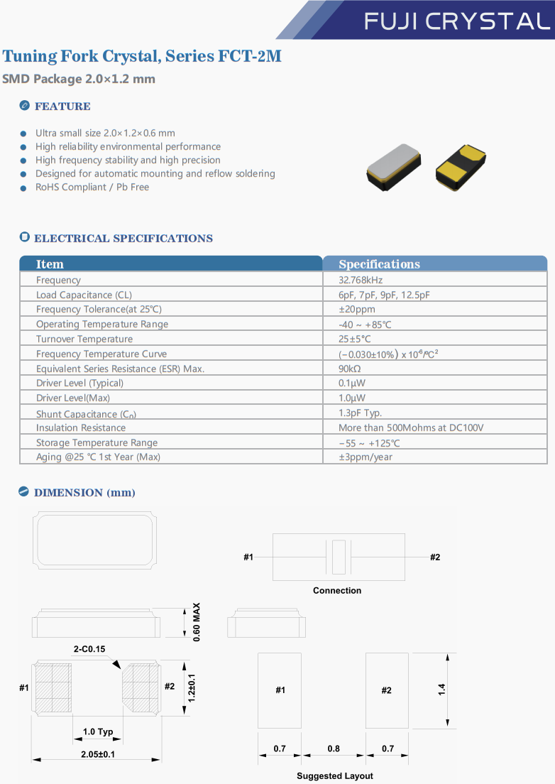FCT2M032768C5D5 | Fuji晶振 | FCT-2M | 32.768 kHz | 12.5pF | -10°C ~ 70°C |