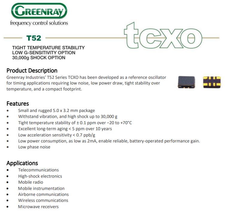 T52-N17-C-3.3-LG-20.0MHz-E,低相噪晶振,6G基站晶振,Greenray晶振,T52石英晶體振蕩器,進口有源晶振,T52-N17-C-3.3-LG-20.0MHz-E晶振,頻率20MHz,5032mm晶振,電壓3.3V,工作溫度-20~70°C,低相位噪聲晶振,低功耗晶振,6G基站晶振,高沖擊電子設備晶振,移動無線電晶振,移動儀器儀表晶振.