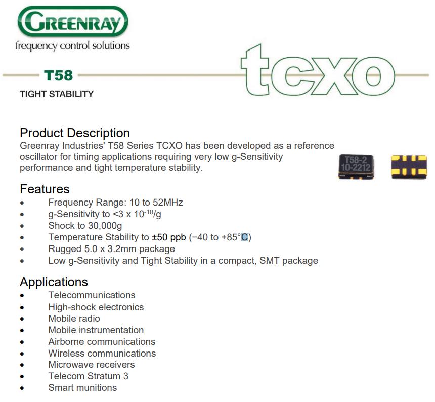 T58-T58-C-LG-48.0MHz-E,TCXO晶振,6G移動無線電晶振,格林雷晶振,T58石英晶體振蕩器,T58-T58-C-LG-48.0MHz-E晶振,5032mm晶振,進口貼片晶振,TCXO晶振,頻率48MHz,電壓3.3V,工作溫度-40~85°C,抗沖擊晶振,高穩定性晶振,6G移動無線電晶振,高沖擊電子設備晶振,機載通信晶振,智能彈藥晶振.