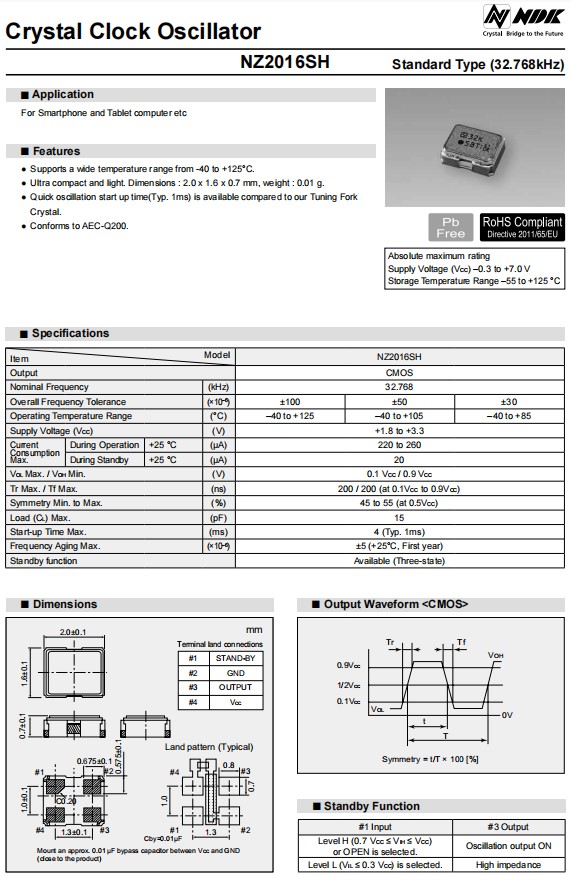 NZ2016SH-24.000MHZNSC5022C平板電腦晶振,NDK晶體振蕩器,日本NDK晶振,進口晶振,NZ2016SH型號是一款小體積晶振尺寸2.0x1.6x0.7mm四腳貼片晶振,32.768KHz晶振,石英晶體振蕩器,有源晶振,無鉛環(huán)保晶振,支持寬溫度范圍從-40°C到+125°C,超緊湊和輕,重量:0.01g,快速振蕩啟動時間(類型,1ms)是可用的相比,符合AEC-Q200,電源電壓(VCC)-0.3至+7.0 V,石英晶體振蕩器具有超小型,輕薄型,耐熱及耐環(huán)境特點,適用于智能手機,平板電腦,鐘表電子,無線網(wǎng)絡,藍牙模塊,可穿戴設備,汽車電子,醫(yī)療設備,物聯(lián)網(wǎng)應用等