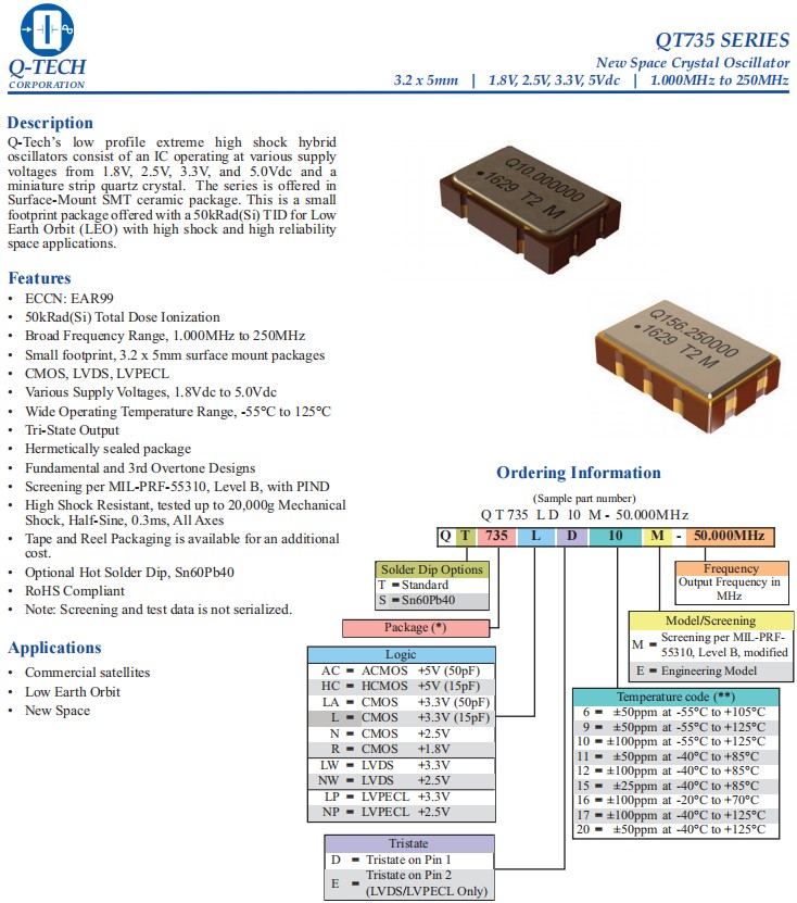 QT735LWE10M-156.250MHz,LVDS差分石英晶振,6G基站晶振, Q-Tech晶振,QT735有源晶振,QT735LWE10M-156.250MHz晶振,電壓3.3V微型石英晶體,LVDS輸出差分石英晶振,頻率156.25MHz,工作溫度-55~125°C,5032mm貼片晶振,小體積晶振,高抗沖擊晶振,高可靠性晶振,低地球軌道應用晶振,新空間應用晶振,商業衛星應用晶振,6G基站晶振.
