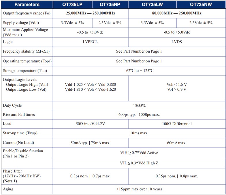 QT735LWE10M-156.250MHz,LVDS差分石英晶振,6G基站晶振參數表