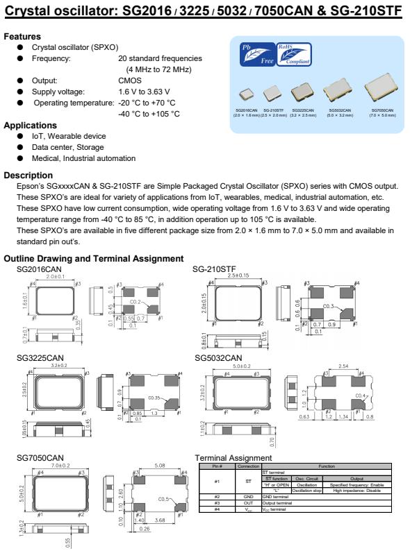 愛(ài)普生的SGxxxxCAN和SG-210STF是具有CMOS輸出的簡(jiǎn)單封裝晶體振蕩器(SPXO)系列。這些SPXO是物聯(lián)網(wǎng)、可穿戴設(shè)備、醫(yī)療、工業(yè)自動(dòng)化等各種應(yīng)用的理想選擇。這些SPXO有源晶振具有低電流消耗,寬工作電壓從1.6 V到3.63 V,寬工作溫度范圍從-40°C到85°C,另外可操作到105°C。這些SPXO的可在五種不同的包裝尺寸從2.0 × 1.6毫米到7.0 × 5.0毫米,可在標(biāo)準(zhǔn)針的。