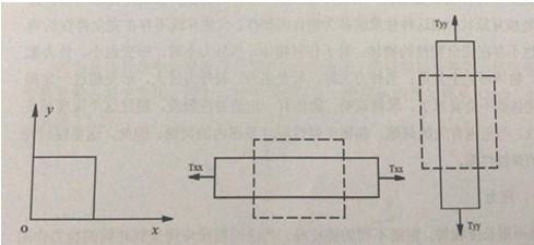如圖2.2.1(a)所示的小方片,當它受到x方向的應力作用時,除在x方向產(chǎn)生伸長外,同時在y方向也產(chǎn)生收縮,如圖2.2.1(b)所示。同樣,當小方片受到y(tǒng)方向的應力作用時,除了在y方向產(chǎn)生伸長外,同時在x方向也產(chǎn)生收縮