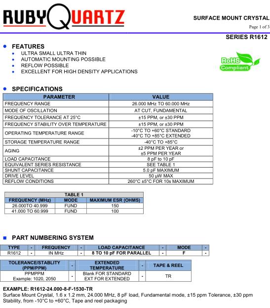 盧柏進口晶振,R1612四腳貼片晶體,R1612-24.000-8-F-1530-TR無源諧振器,石英晶振高精度晶片的拋光技術:貼片晶振是目前晶片研磨技術中表面處理技術的最高技術,最終使晶振晶片表面更光潔,平行度及平面度更好,降低諧振電阻,提高Q值.從而達到一般研磨所達不到的產品性能,使石英SMD晶振的等效電阻等更接近理論值,使晶振可在更低功耗下工作.使用先進的牛頓環及單色光的方法去檢測晶片表面的狀態.