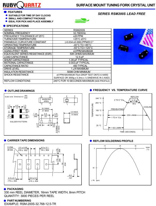 Rubyquartz高質量晶振,RSM200S水晶振動子,RSM-200S-32.768-12.5-TR晶振,32.768K時鐘晶體具有小型,薄型,輕型的貼片表面音叉型晶體振蕩器,產品具有優良的耐熱性,耐環境特性,可發揮晶振優良的電氣特性,符合RoHS規定,滿足無鉛焊接的高溫回流溫度曲線要求,金屬外殼的封裝使得產品在封裝時能發揮比陶瓷振蕩器外殼更好的耐沖擊性.