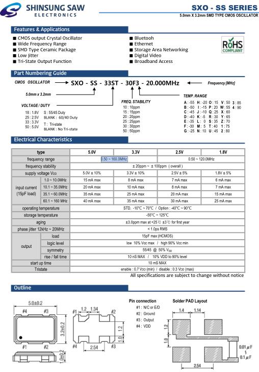 SHINSUNG低抖動(dòng)晶振,SXO-SS通信設(shè)備晶振,SXO-SS-33ST-30F3-24.000MHz晶振,小型SMD有源晶振,從最初超大體積到現(xiàn)在的7050mm,6035mm,5032mm,3225mm,2520mm體積,有著翻天覆地的改變,體積的變小也使產(chǎn)品帶來了更高的穩(wěn)定性能,接縫密封石英晶體振蕩器,精度高,覆蓋頻率范圍寬的特點(diǎn),SMD高速自動(dòng)安裝和高溫回流焊設(shè)計(jì),Optionable待機(jī)輸出三態(tài)輸出功能,電源電壓范圍:1.8V~5V,高穩(wěn)定性,低抖動(dòng),低功耗,主要應(yīng)用領(lǐng)域:無線通訊,高端智能手機(jī),平板筆記本W(wǎng)LAN,藍(lán)牙,數(shù)碼相機(jī),DSL和其他IT產(chǎn)品的晶振應(yīng)用,三態(tài)功能,PC和LCDM等高端數(shù)碼領(lǐng)域,符合RoHS/無鉛.