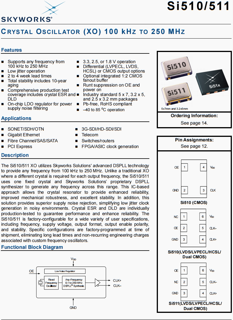 511BCA156M250AAG | Skyworks晶振 | Si511 | XO | 156.25 MHz | LVDS | 3.3V | ±20ppm |