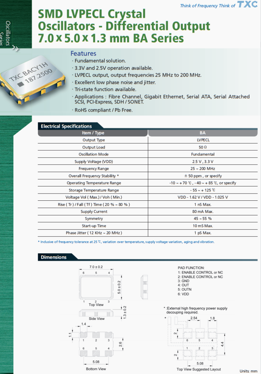 BA50070002 | TXC晶振 | BA | 50 MHz | LVPECL | 3.3V | ±50ppm |