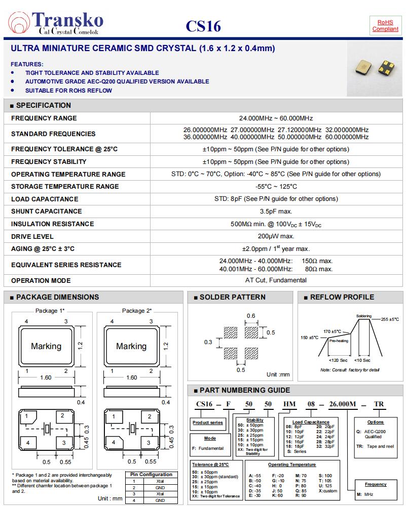 特蘭斯科晶振,CS16-F3030CU08-48.000M-TR,車載遙控器晶振參數(shù)表