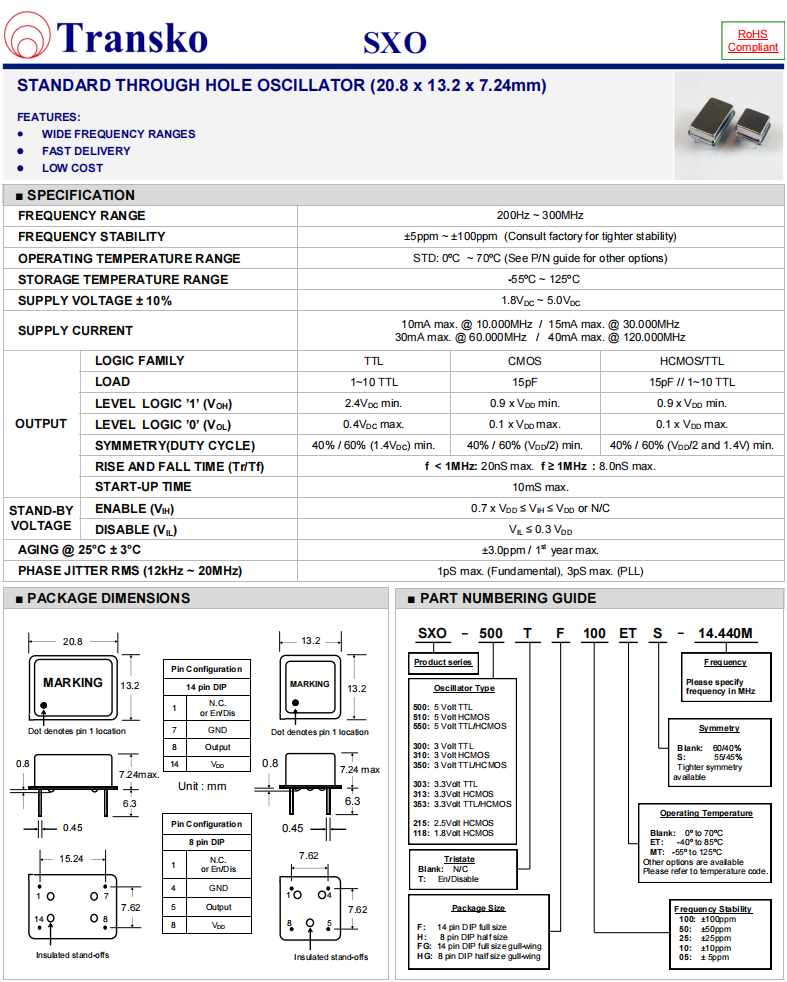 SXO-510TF50ET-16.000M,歐美Transko鐘振,6GWIFI應用晶振參數表