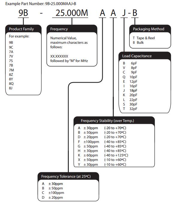 不管進口晶振品牌還是國產晶振品牌,每個品牌產品系列都有相對應的料號,料號后面還有產品編碼。那很多時候晶振料號和編碼我們總是搞不清楚,到底怎么去區別,今天我們就來說說臺產晶振品牌,TXC晶振料號編碼如何分辨,現在我們先來看看:7A-16.000MAAE-B這顆無源晶振,這是一顆5032mm尺寸晶振,TXC晶振品牌的料號是7A,編碼是7A-16.000MAAE-那這個料號代表是什么呢?比如7A是TXC晶振料號,16.000M是代表頻率,A就代表額定頻率偏差是+-30ppm,當然也可能是B,如果是B的話就代表50ppm,C的話就代表100ppm,D的話就代表20ppm,按字母分辨,后面那個A就代表溫度精度的頻率偏差,30ppm,隨著溫度的變化,溫度的不一樣,參數也會跟著變化,比如K,那頻率穩定度就是+-60ppm,這個溫度參數就屬于汽車級晶振,工業級晶振產品了,后面在J的話就表示晶振負載電容,這個負載電容就是18pf,假如是K的話就代表TXC晶振的負載電容是20PF,按照字母以此類推,然后在最后面T或者B的話就代表包裝,編帶還是袋裝分類了。我解釋的這么清楚,小盆友們應該都對TXC晶振了解了吧,如果還不了解就打TXC晶振技術部門電話0755-27838351資訊吧。