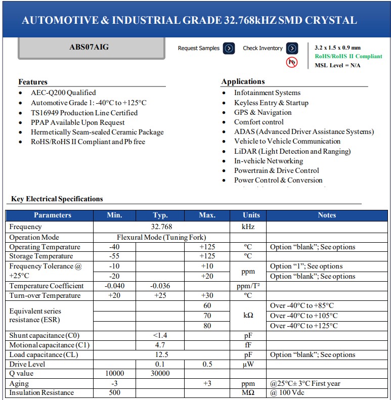 Abracon晶振ABS07AIG是一種高溫石英晶體,小體積尺寸3.2x1.5mm兩腳貼片晶振,32.768K晶振,石英晶體諧振器,通過AEC-Q200認(rèn)證,并通過TSI6949生產(chǎn)線認(rèn)證。該器件具有-40°C至+125°C的寬工作溫度范圍,是極端環(huán)境下商業(yè)或工業(yè)應(yīng)用的完美解決方案。憑借超薄的外形,無源晶振ABS07AIG可以在空間受限的設(shè)計中實現(xiàn),如可穿戴設(shè)備或車輛的信息娛樂系統(tǒng)。這種石英晶體采用密封的陶瓷封裝,在導(dǎo)航,智能手機(jī),無線通信,車載晶振等應(yīng)用中具有長期可靠性。與其ABS07系列類似,automotive系列可以執(zhí)行低至10ppm的嚴(yán)格頻率穩(wěn)定度,以確保其時間管理精確無誤。雖然ABS07AIG系列可以執(zhí)行額外的要求,但它針對低功耗進(jìn)行了優(yōu)化,以延長電池壽命,因此非常適合各種應(yīng)用。汽車導(dǎo)航專用石英晶體ABS07AIG-32.768KHZ-D-T