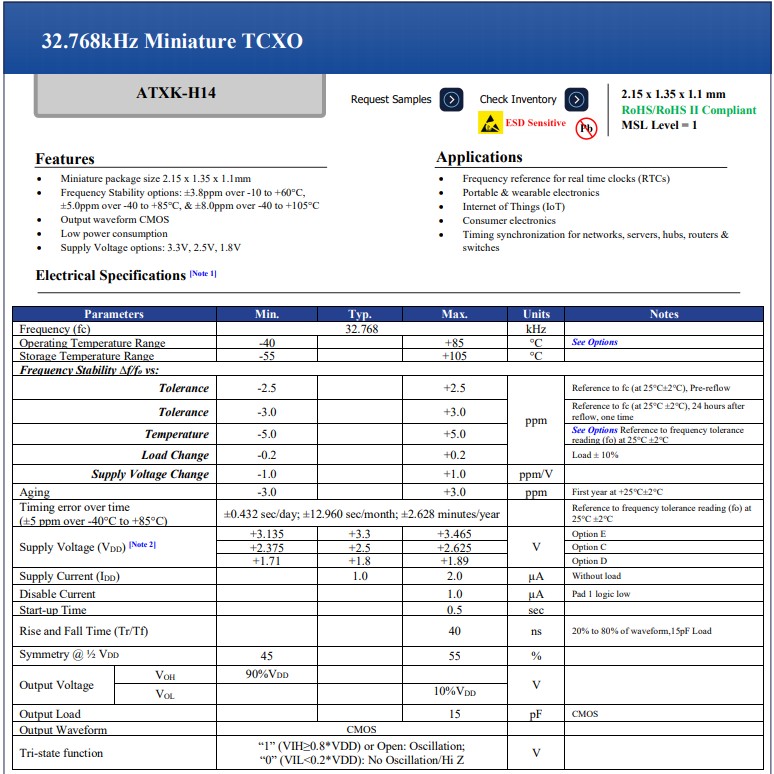 ATXK-H14 | kHz TCXO | 2.15 x 1.36 | 32.768 kHz | 3.3V、2.5V、1.8V | 3.8 / 5.0 / 8.0 |