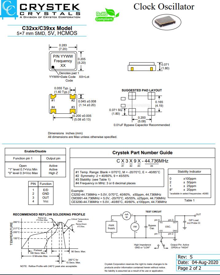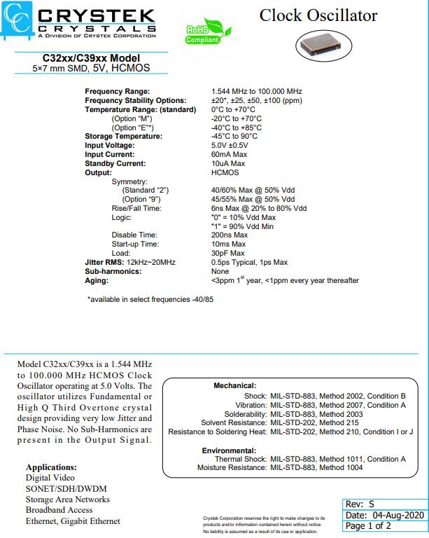 CE3392-20.480 | CRYSTEK晶振 | C33 | XO (Standard) | 20.48MHz | ±50ppm | -40°C ~ 85°C |