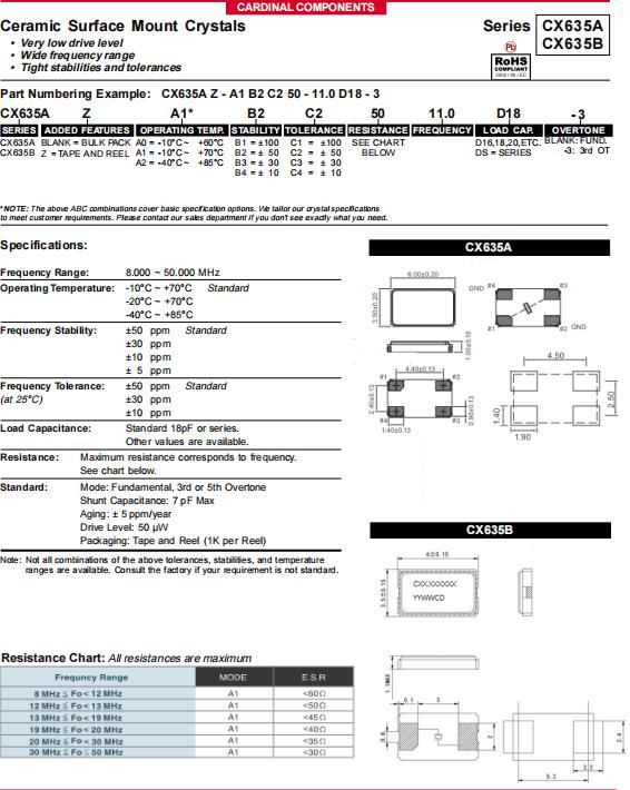 CX635A-A5B2C3-40-18.432D13 | 卡迪納爾晶振 | CRYSTAL 18.4320MHZ 13PF SMD | CX635A | 18.432MHz | ±50ppm | 40 Ohm | -20°C ~ 70°C |