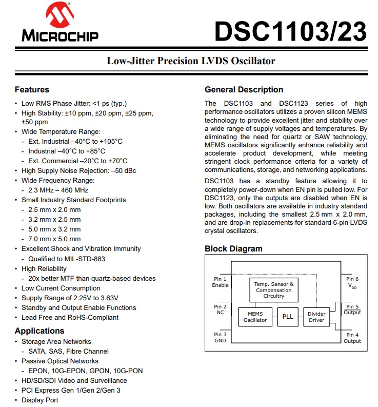 DSC1103CI2-125.0000 | Microchip晶振 | DSC1103 | 125MHz | 2.25 V ~ 3.6 V | MEMS (Silicon) |