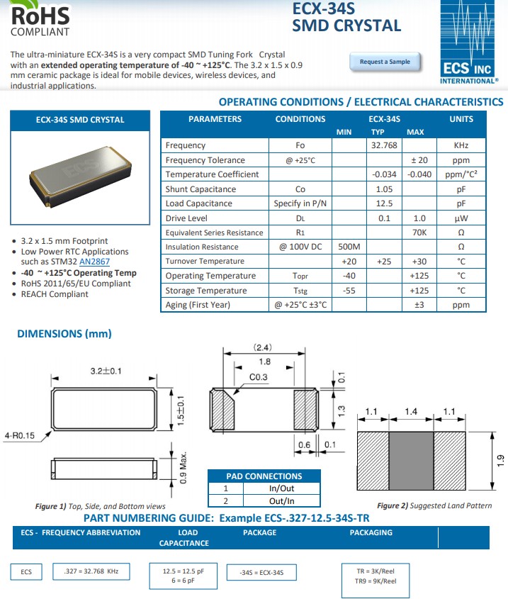 ECS-.327-9-34R-TR | ECScrystal | ECX-34R | 32.768kHz | -40°C ~ 85°C | 2-SMD, No Lead |