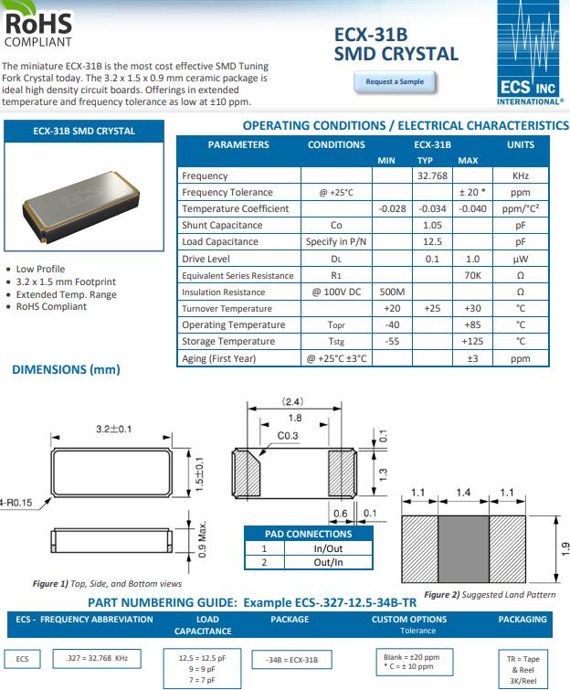 ECS-.327-7-34B-TR | ECS晶振 | ECX-31B | kHz Crystal (Tuning Fork) | 32.768kHz | -40°C ~ 85°C |