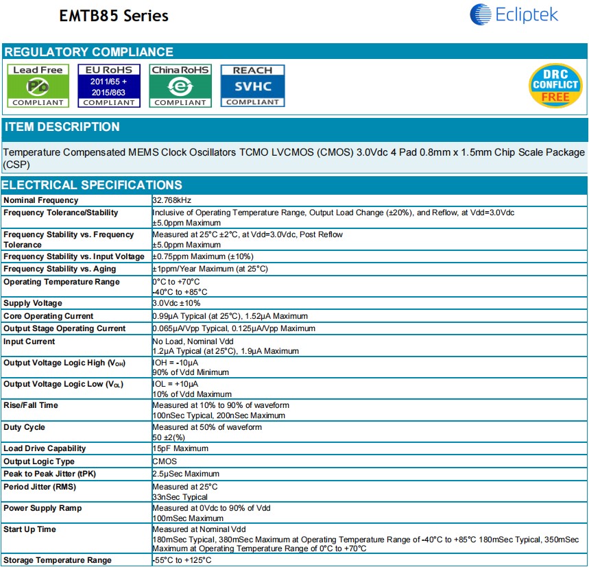 EMTB85A8D-32.768K | CMOS | 3.0Vdc | CSP 0.8mm x 1.5mm | ±5.0ppm | -40°C to +85°C |
