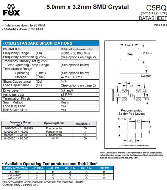 FQ5032BR-16.000 | FOX晶振 | C5BQ | MHz Crystal | 16MHz | ±50ppm |