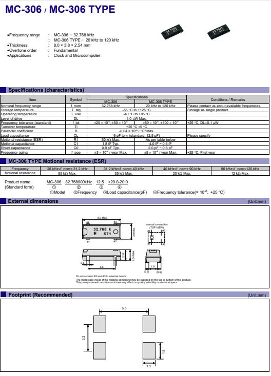 Q13MC3062007300 | 8 x 3.8 x 2.54 mm | MC-306 | 32.768kHz | 22 pF | +/-50.0 ppm | -40 to +85 °C |