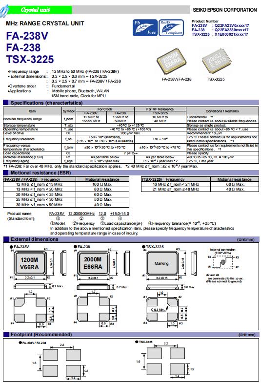 Q22FA2380180016 | 3.2 x 2.5 x 0.7mm | FA-238 | 19.200000 MHz | 7 pF | +/-20 ppm | +/-30 ppm | -20 to +70 °C | ≤ 80 Ω |