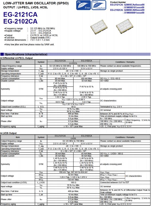 Q3805CA00019400 | EG-2121CA | 98.304000 MHz | 7.00 x 5.00 x 1.20 mm | LV-PECL | 2.375 to 2.625 V | 0 to 70 °C |