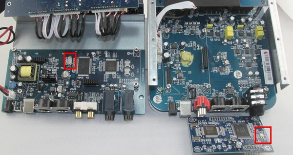 我們把它放大來(lái)看一下會(huì)比較清晰一點(diǎn),那現(xiàn)在就能很明顯的看到晶振了,如果不仔細(xì)看,可能會(huì)忽略了這個(gè)小東西, Mobile U沒有Cube 4 nano穩(wěn)定的罪魁禍?zhǔn)拙褪菆D中紅框內(nèi)部分。晶振是聲卡的心臟,穩(wěn)定的跳動(dòng)才不會(huì)出現(xiàn)問題。Mobile U用的晶振是普通的石英晶體諧振器,Cube 4 nano用的是高精度的有源晶振,此晶振分布在聲卡USB和電腦通訊的主控旁邊,晶振的不穩(wěn)定,可能會(huì)造成爆音、失真等問題。