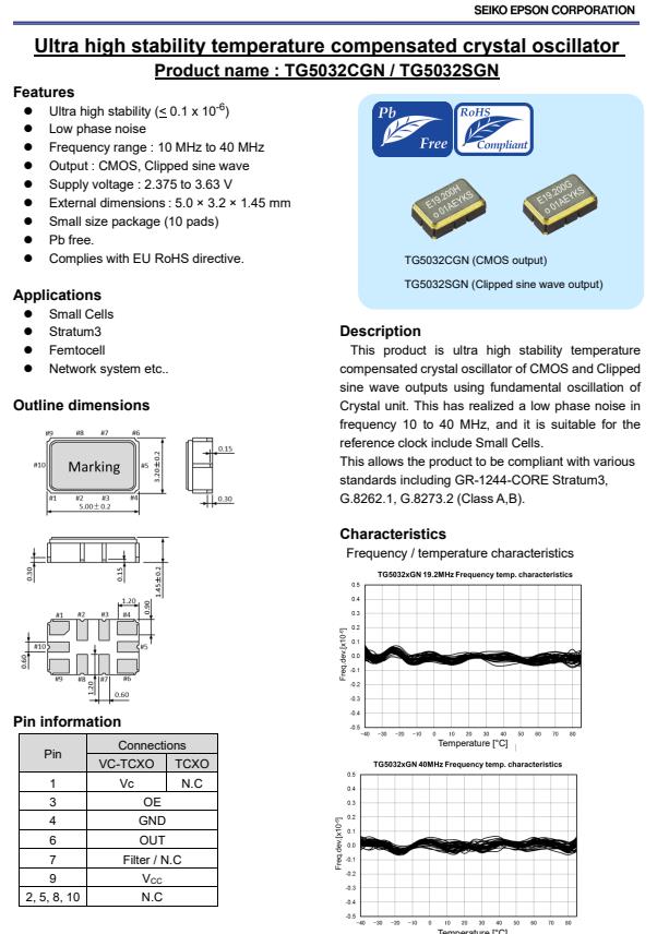 X1G005241001400 | TG5032SGN | 10.000000 MHz | 5.00 x 3.20 x 1.45 mm | Clipped sine wave | 3.135 to 3.465 V | +/-1.0 ppm | -40 to ++85 °C |